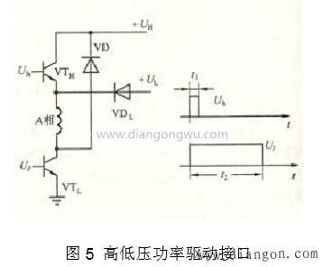 高壓和低壓電源驅(qū)動(dòng)器接口如圖5所示。高壓和低壓驅(qū)動(dòng)器的設(shè)計(jì)思想是使用高壓UH電源來(lái)增加導(dǎo)電相繞組的電流前沿,而與電動(dòng)機(jī)的工作頻率無(wú)關(guān),并且在該前沿之后,使用一個(gè)低電壓UL保持繞組電流。這種效果還改善了驅(qū)動(dòng)器的高頻性能,并消除了額外的損耗,因?yàn)椴恍枰獙㈦娮杵鱎串聯(lián)連接。高壓和低壓驅(qū)動(dòng)器電源接口還具有兩個(gè)輸入控制信號(hào)Uh和Ul,必須保持同步(如圖5所示),并且前沿同時(shí)跳躍。在圖中,高壓管VTH的導(dǎo)通時(shí)間t1不能太大或太小。如果太大,電動(dòng)機(jī)電流將過(guò)載,如果太小,動(dòng)態(tài)性能將不會(huì)得到很大改善。通常,它可以是1到3毫秒。 (當(dāng)該值等于電動(dòng)機(jī)的電氣時(shí)間常數(shù)時(shí)更合適。){{Paging}}