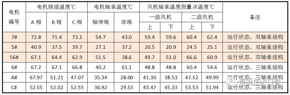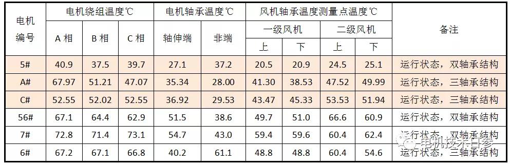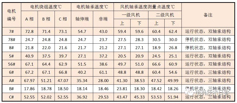 以下是某單位使用的兩級羅茨鼓風機配套電機的一組實測數據。本數據中對應的規格為9臺6kV和400 kW電機,由滑輪驅動。測量數據包括電機繞組、電機軸承以及一次和二次風扇軸承的溫度。其中4臺電機為三軸承結構,5臺電機為一球一柱雙軸承結構。其中3臺電機處于停機狀態,6臺電機處于運行狀態。根據6臺運行電機的數據,對相關因素進行了定性分析。