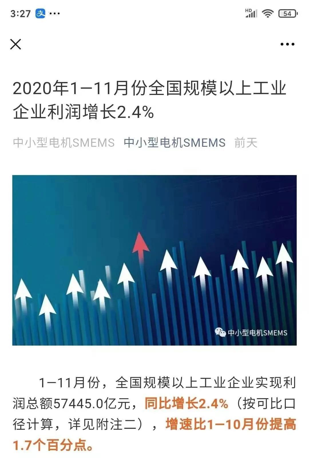 中小型電機行業協會統計數據顯示:2020年1—11月份,全國規模以上工業企業實現利潤總額57445.0億元,同比增長2.4%(按可比口徑計算),增速比1—10月份提高1.7個百分點。